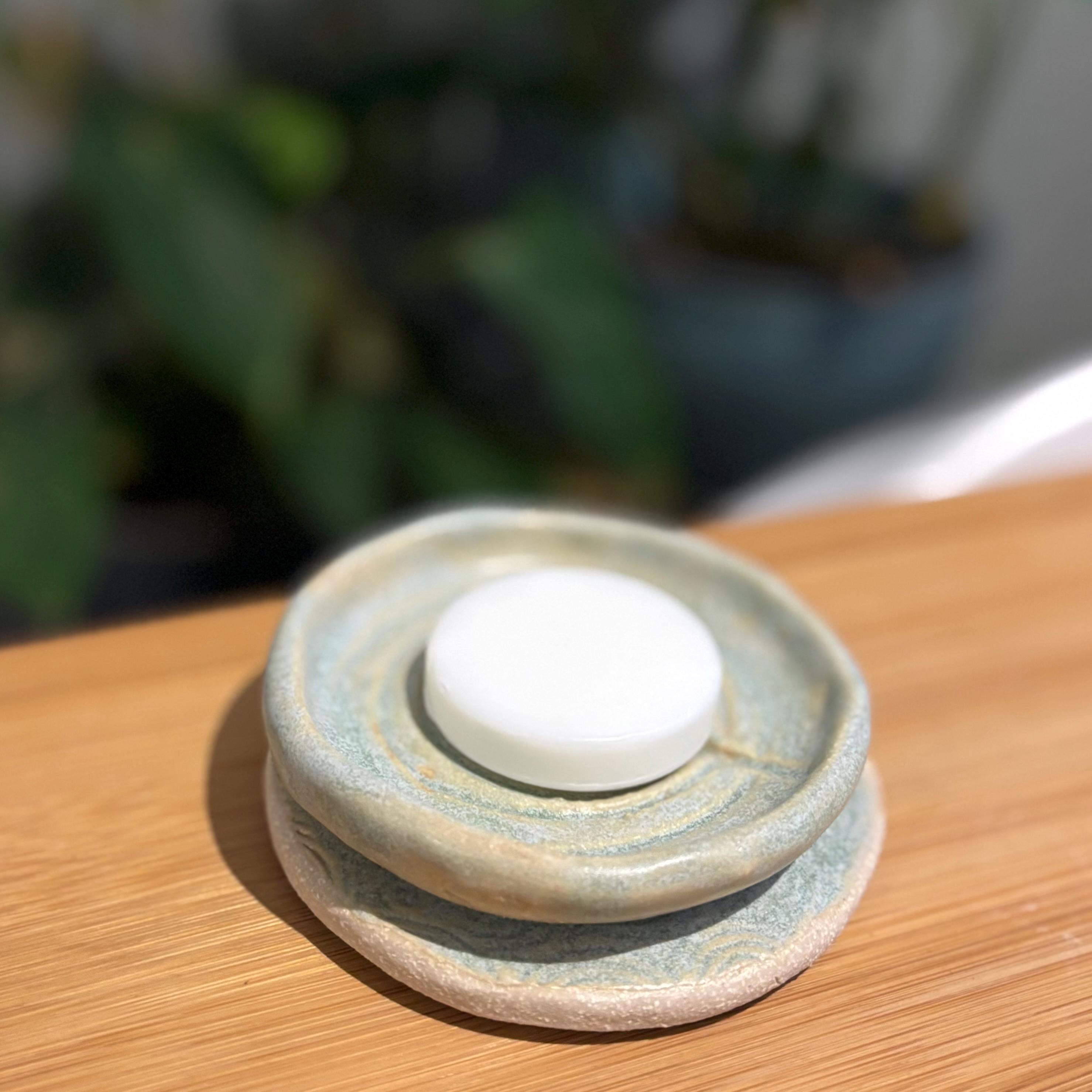 This draining soap dish is made of a buff stoneware clay and glazed in ‘patina ’. It comes in two parts and measures approximately 90mm in diameter, 25mm high.