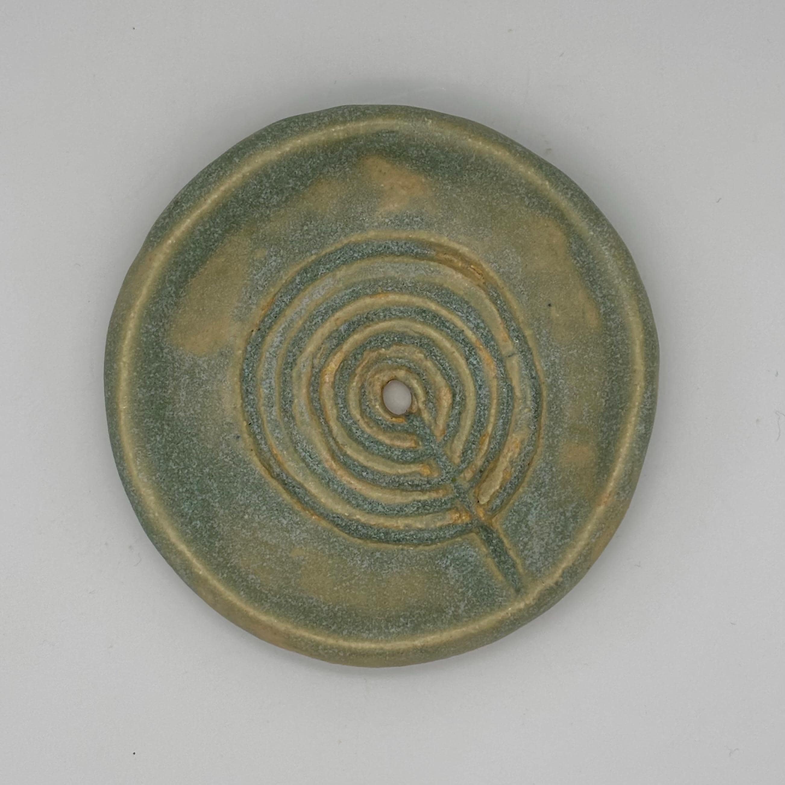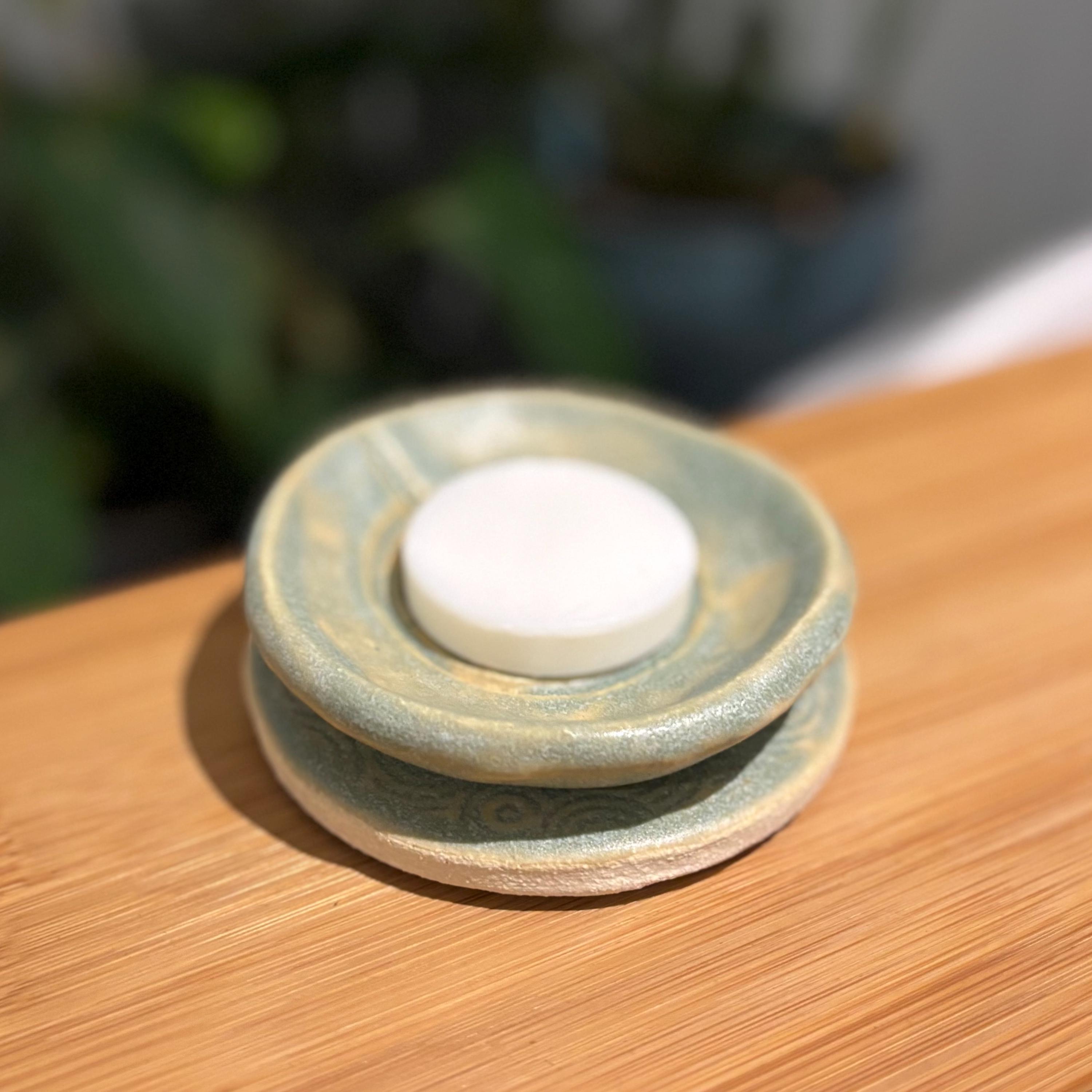 This draining soap dish is made of a buff stoneware clay and glazed in ‘patina ’. It comes in two parts and measures approximately 90mm in diameter, 30mm high.