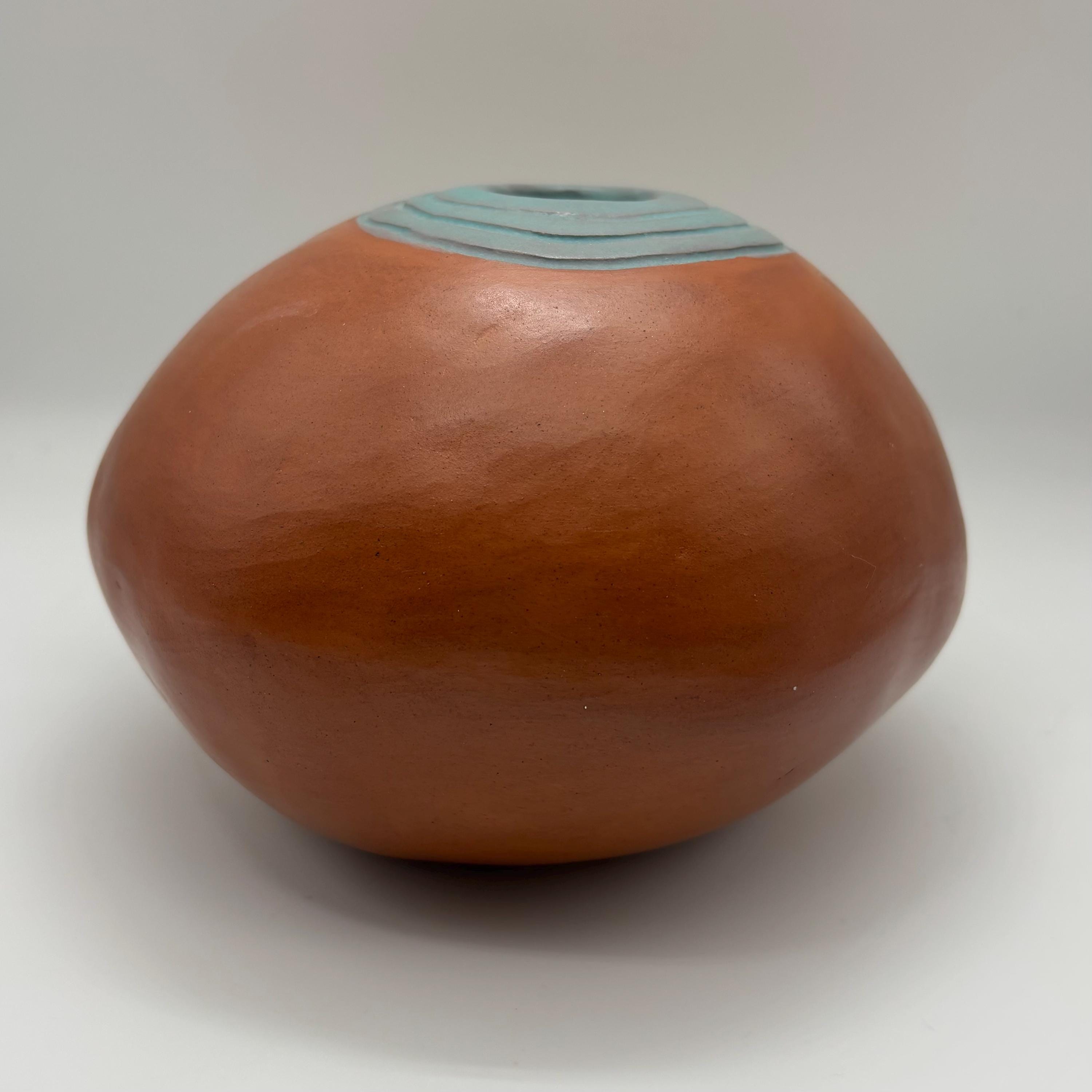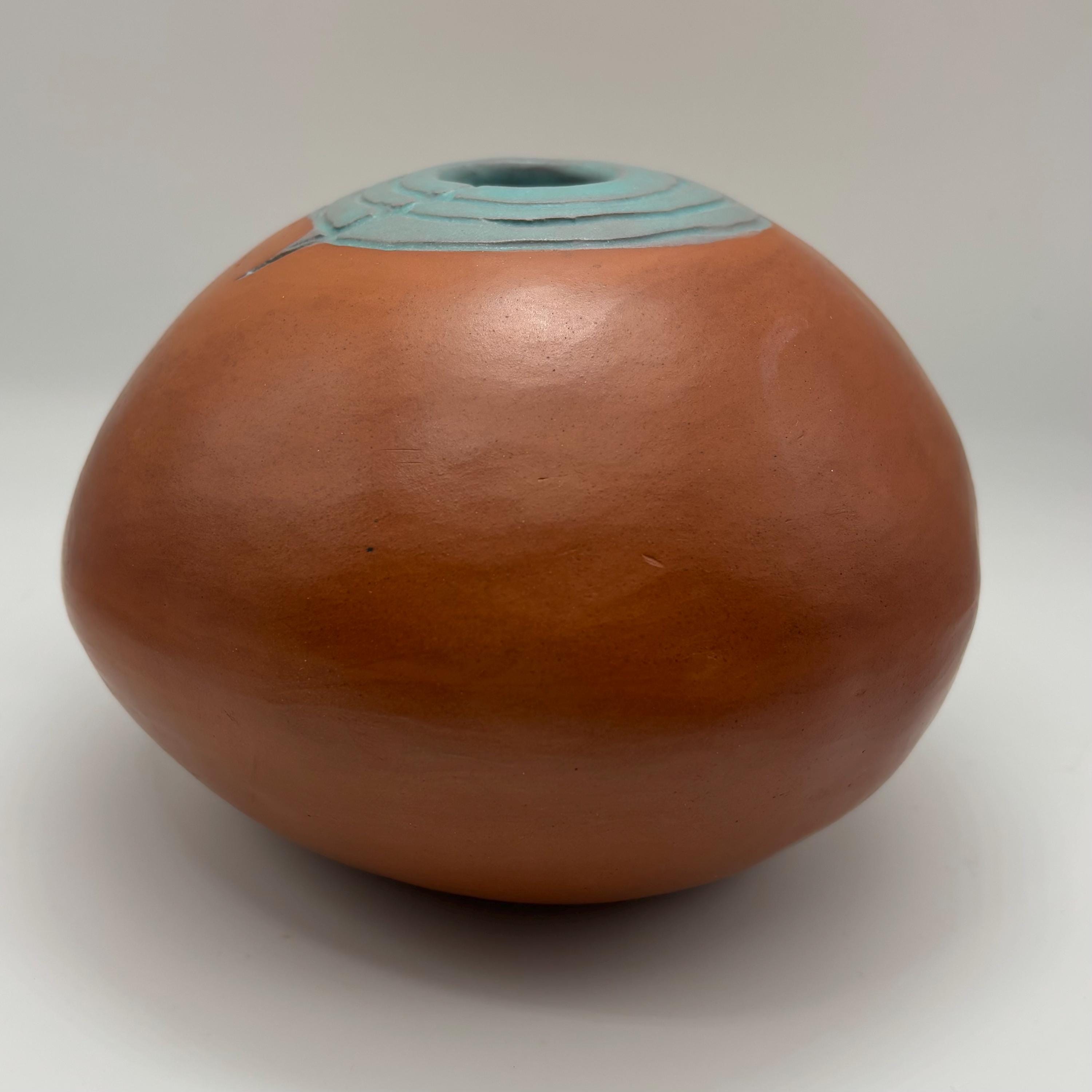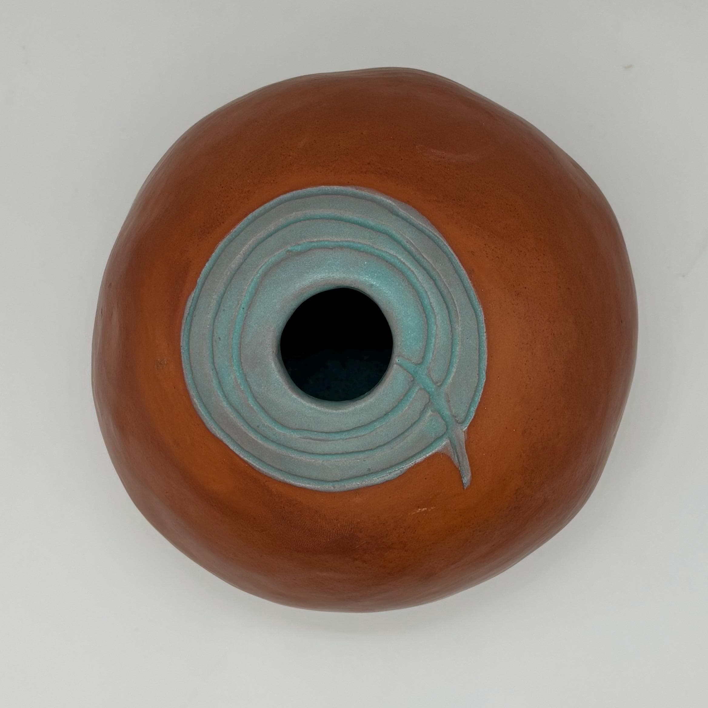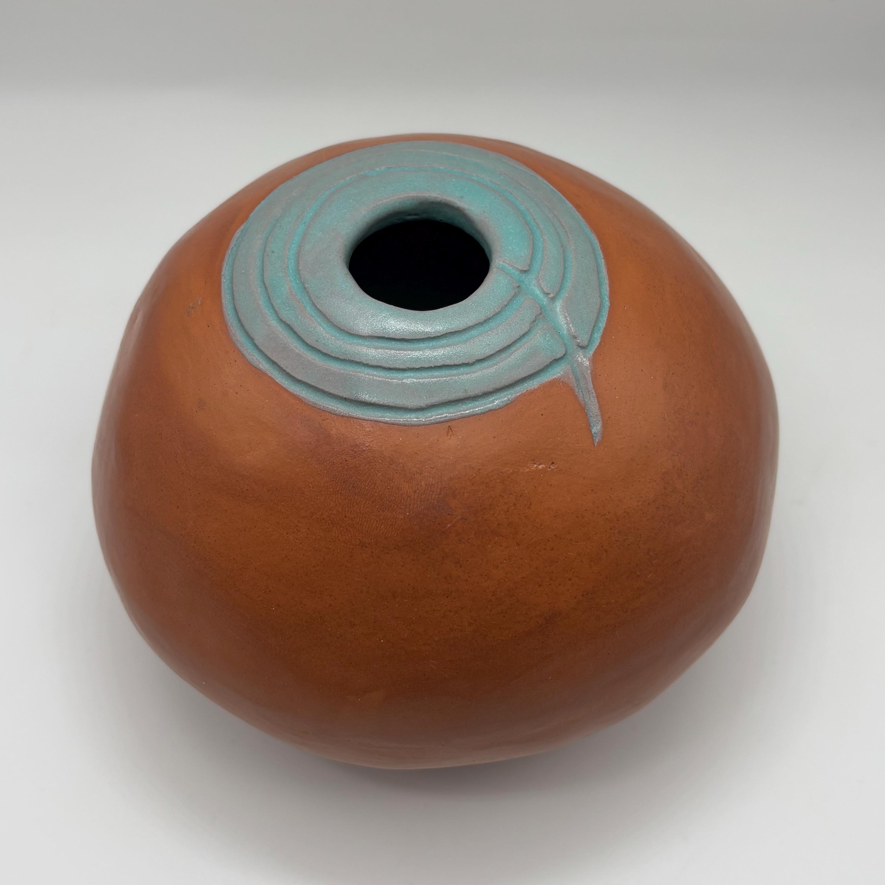 This small pot has been hand built using coils of terracotta clay. Using the ancient technique of burnishing using a smooth pebble the clay has been given a beautiful sheen before bisque firing. A 'cup-and ring' motif is carved on top and highlighted in verdigris glaze.