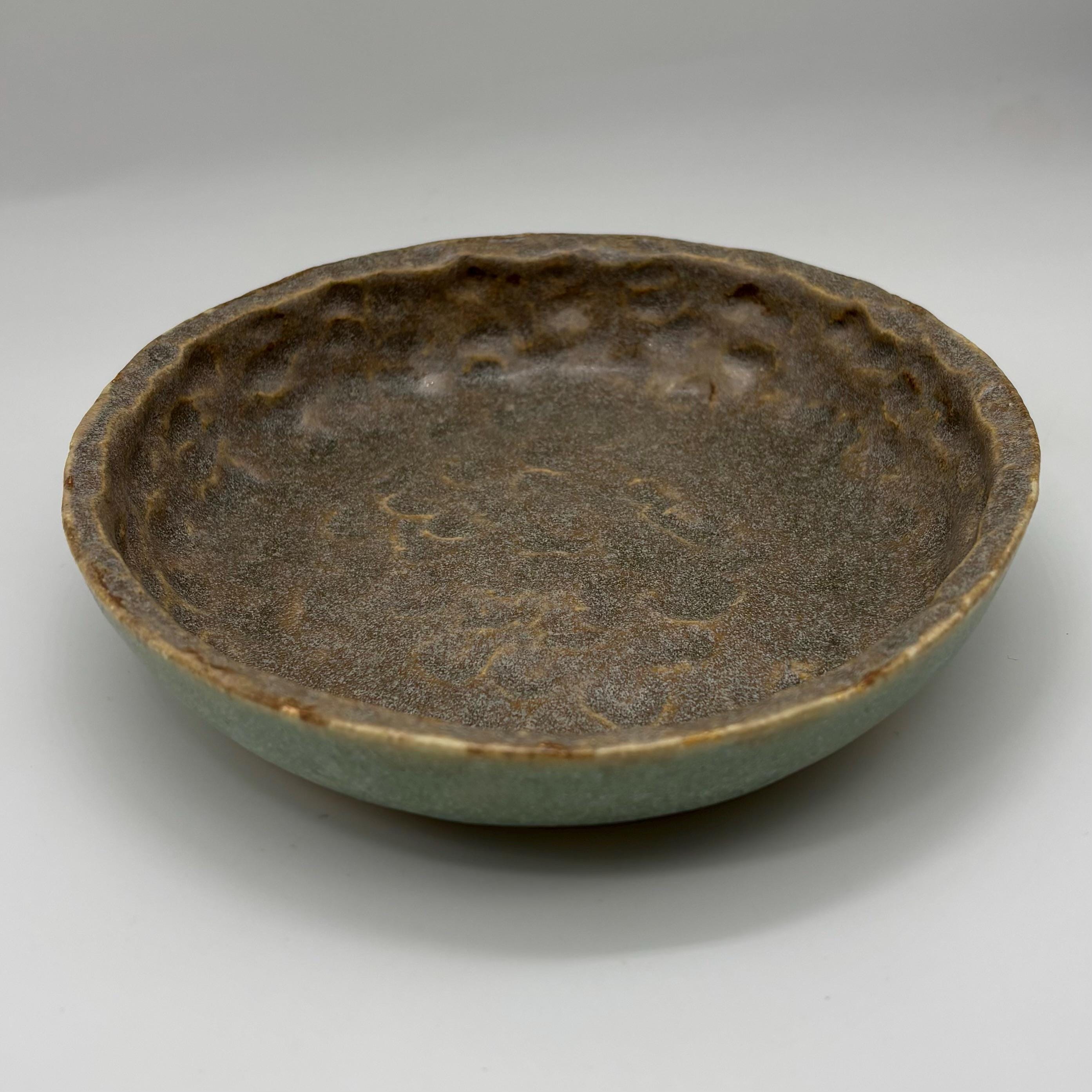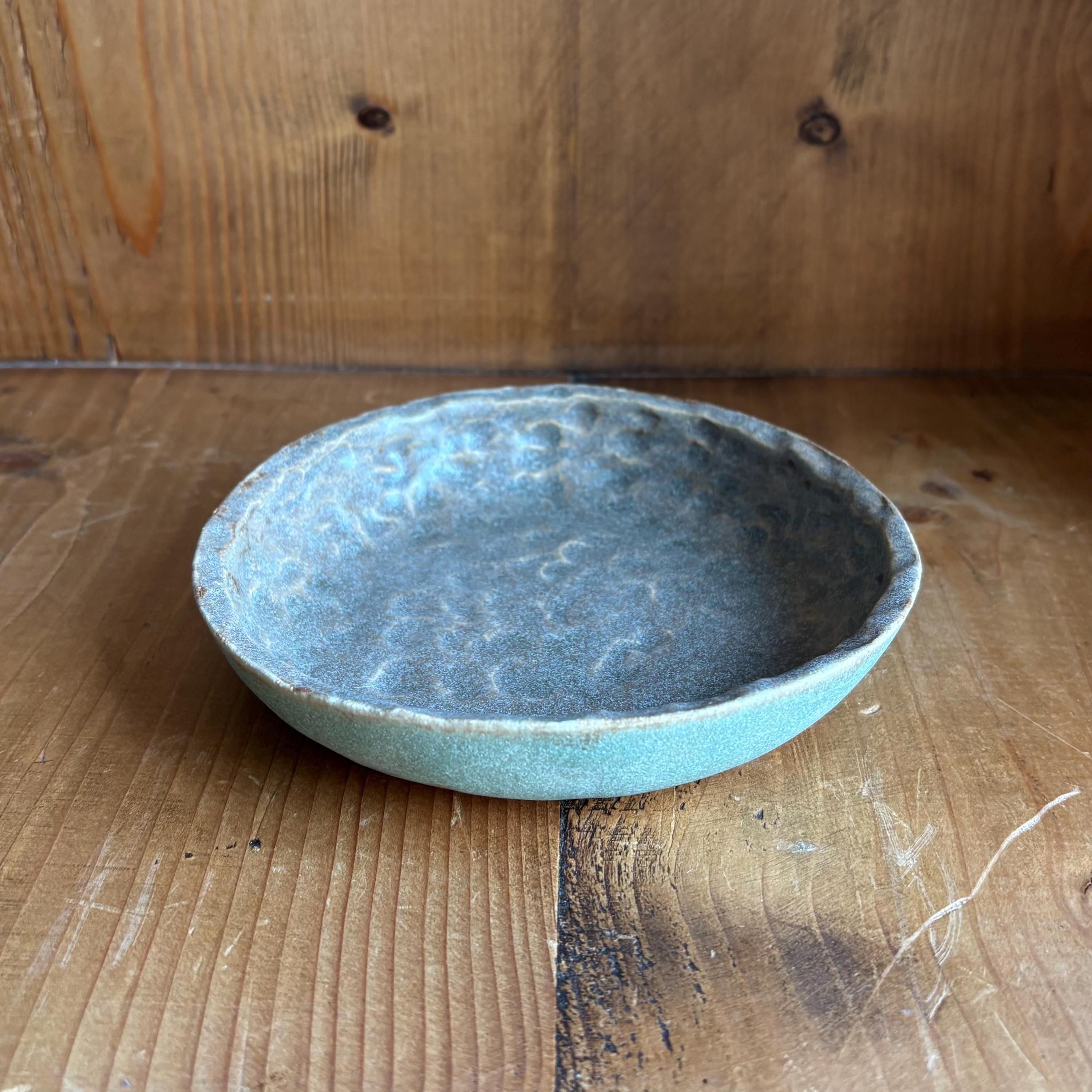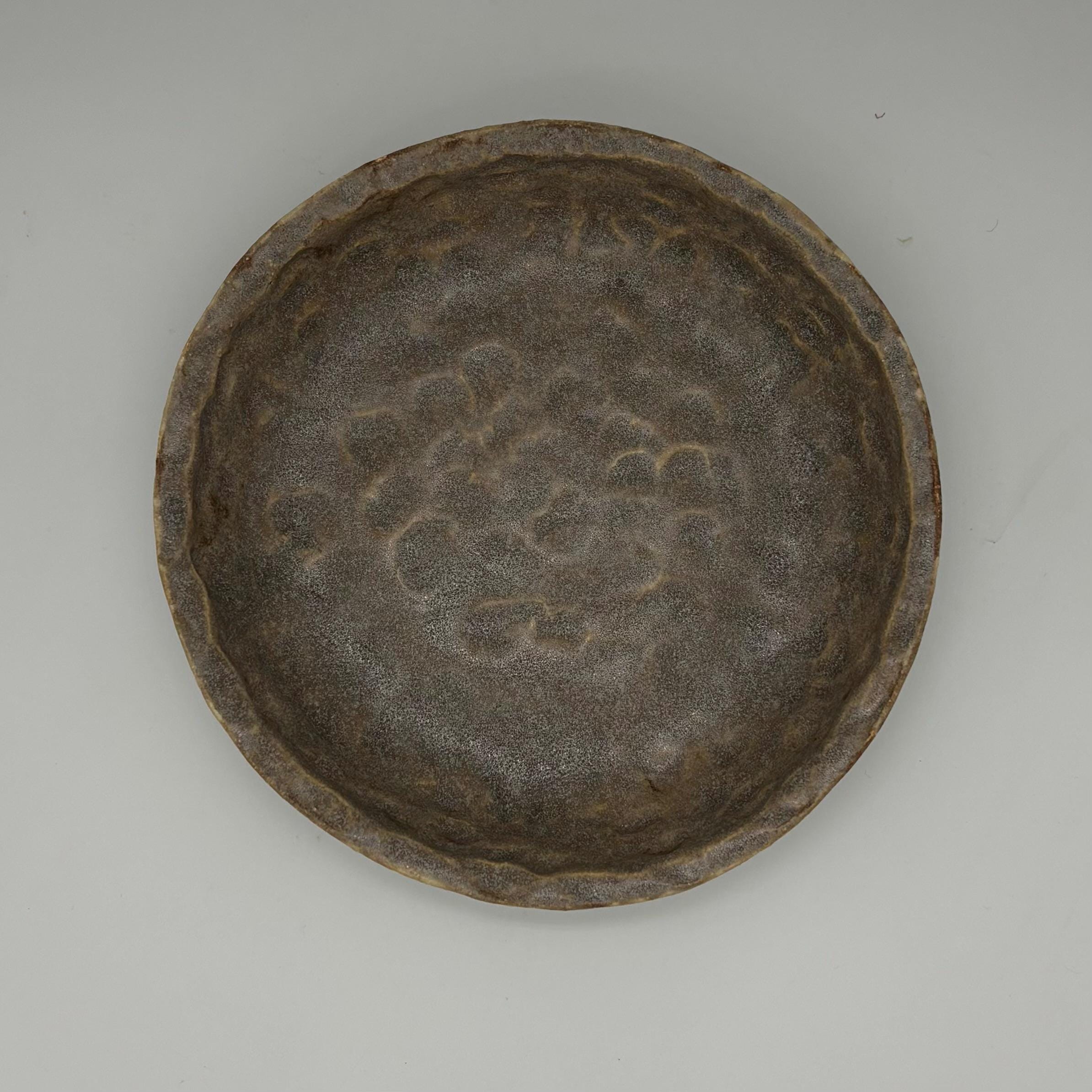 This dish is made of a buff stoneware clay and glazed in patina and basalt grey. It measures approximately 145mm in diameter, 25mm high.