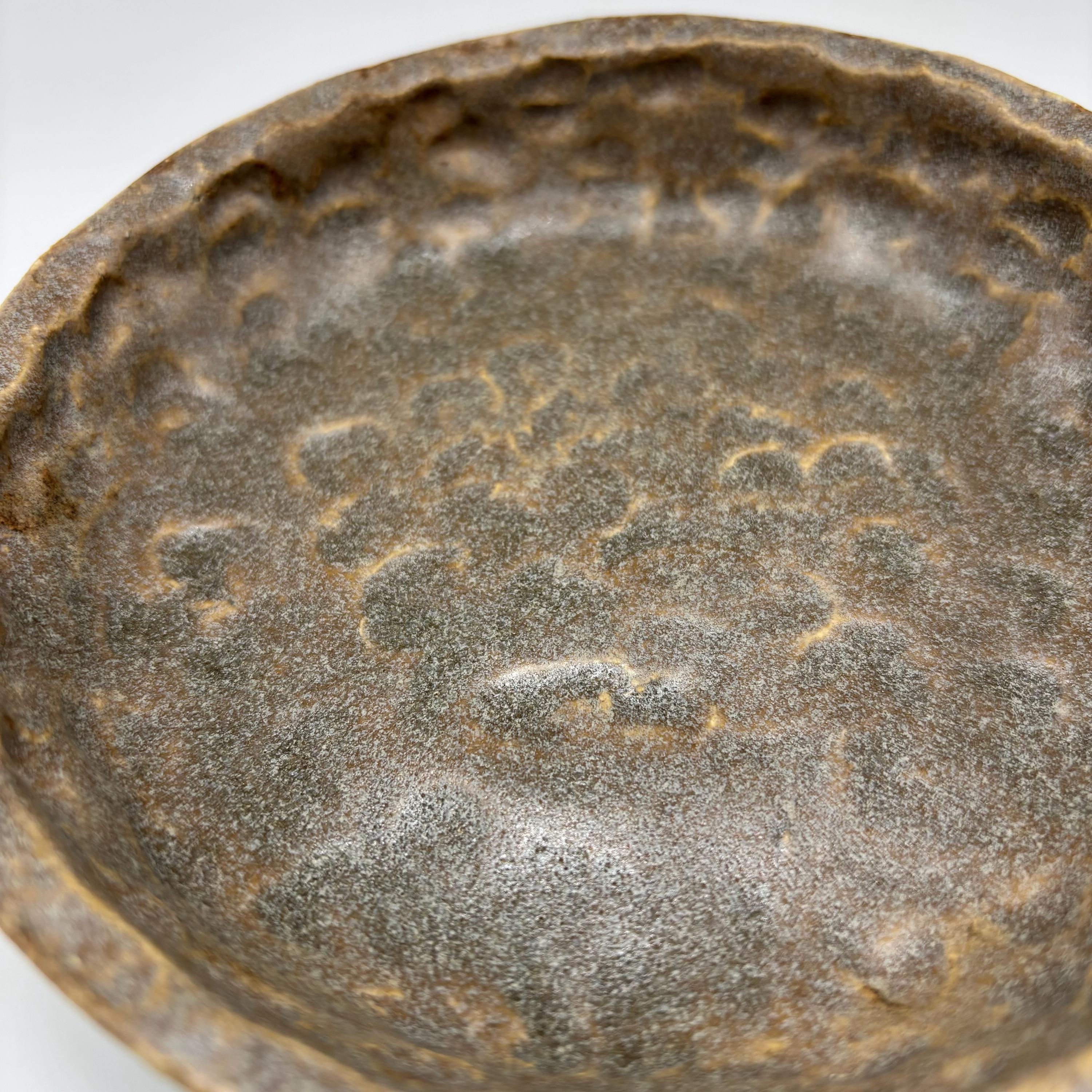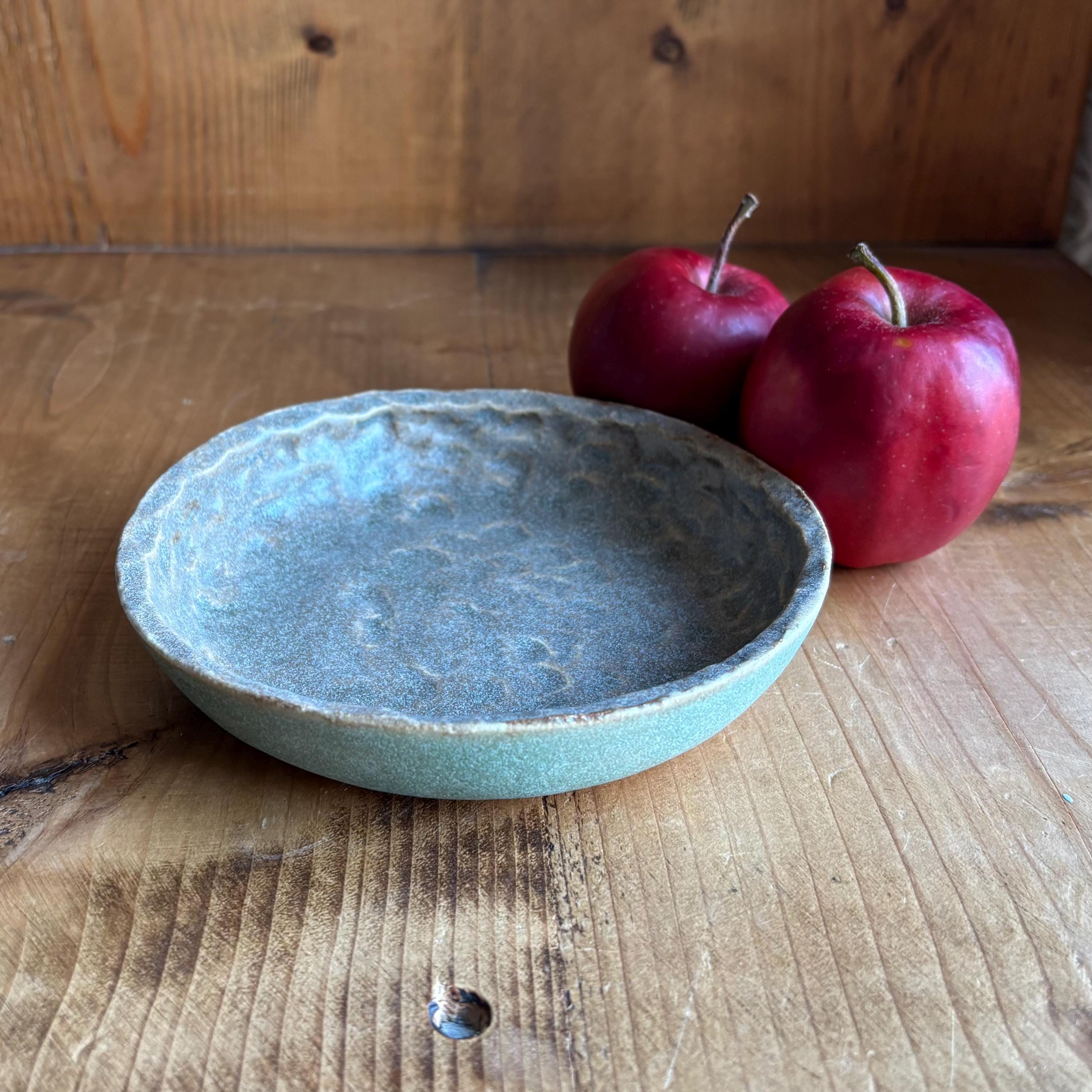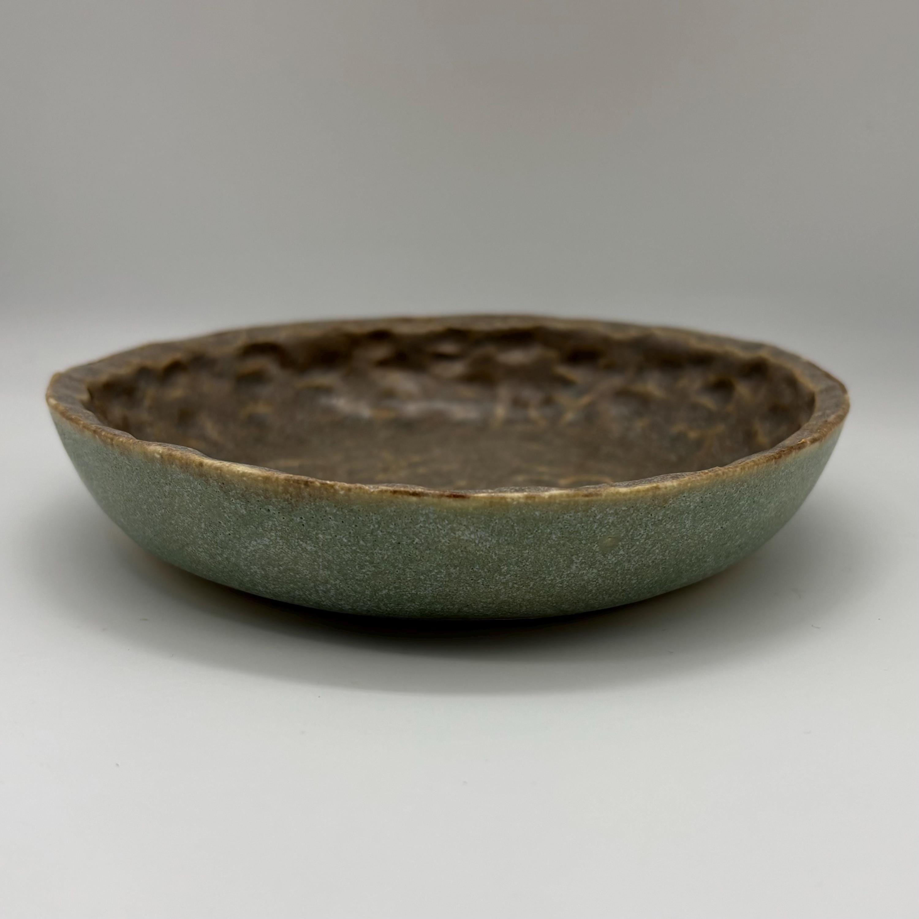 This dish is made of a buff stoneware clay and glazed in patina and basalt grey. It measures approximately 145mm in diameter, 25mm high.