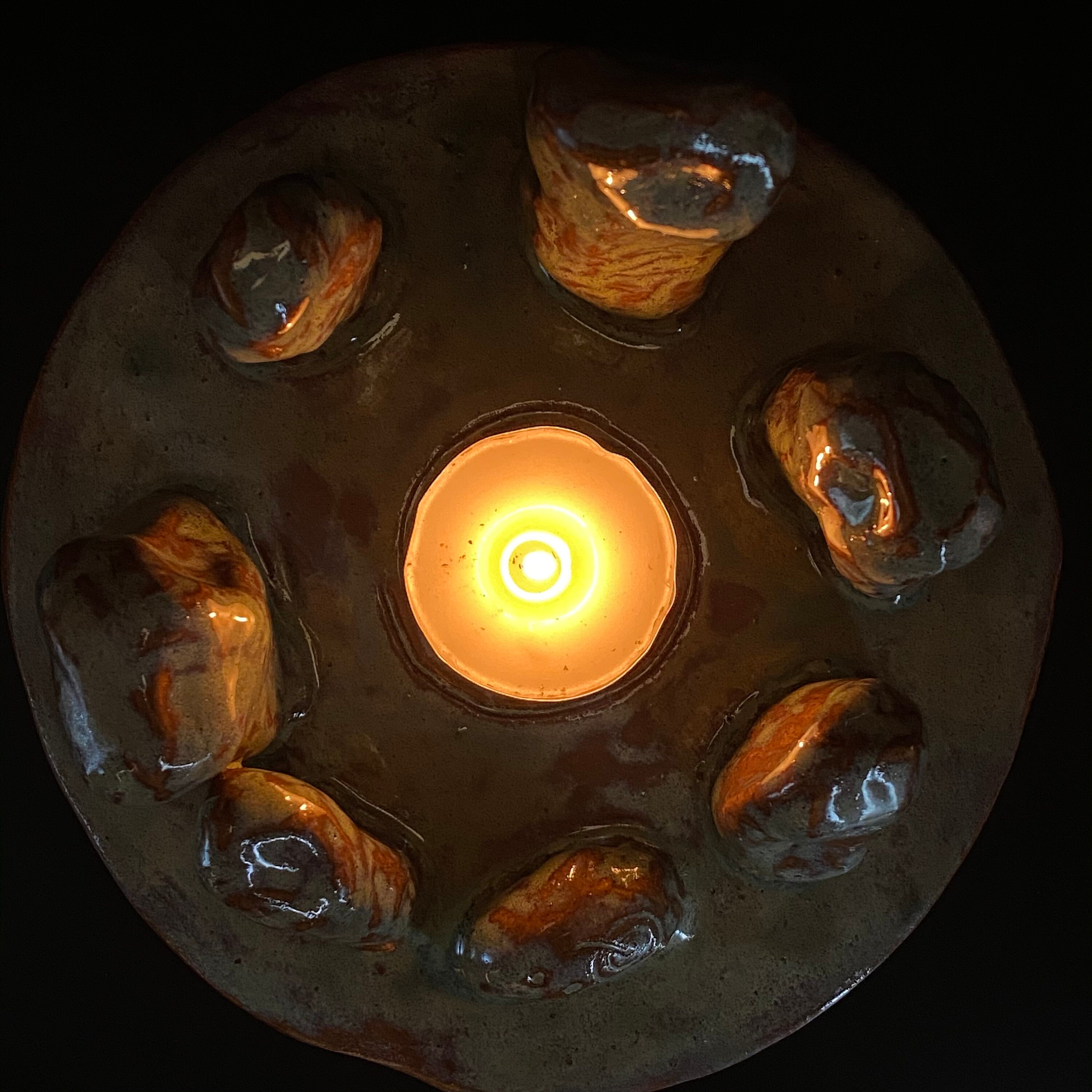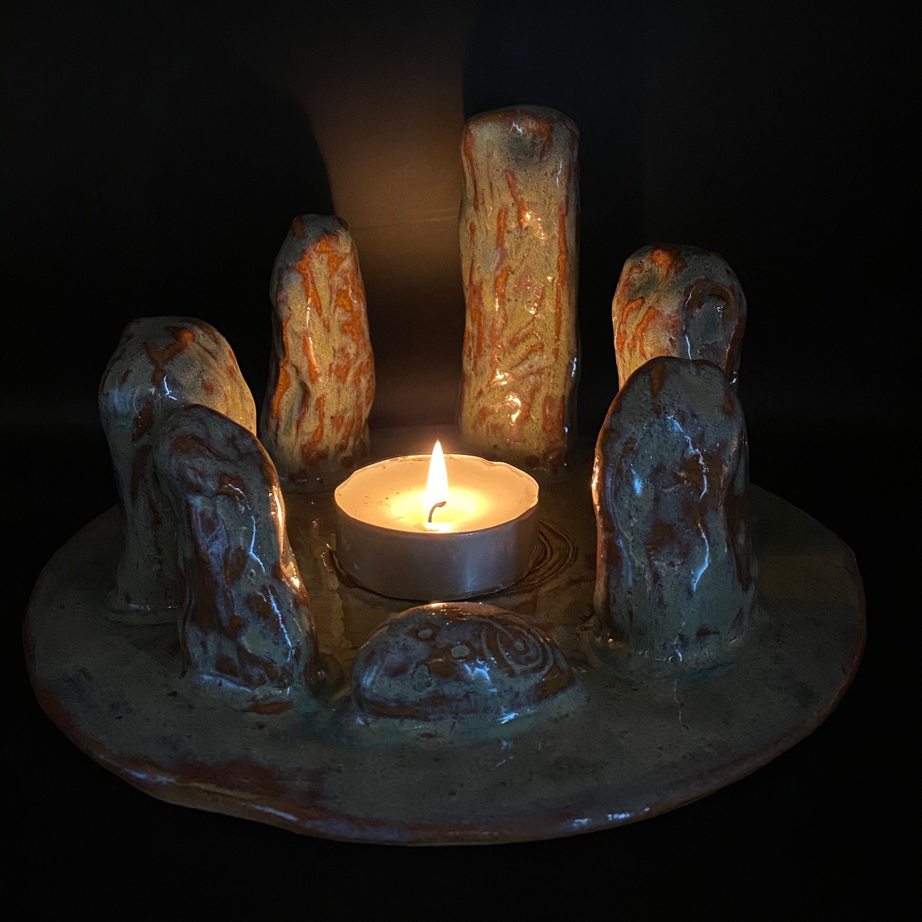 This unique stoneware tea light holder is inspired by the many enigmatic standing stones and stone circles found in Britain and Ireland. Your tea light can be stood on the ancient motif which is reminiscent of Stone and Bronze Age petroglyphs. This stone circle is robust enough for the outdoors and so great for summer evenings. The candlelight causes the standing stones to cast shadows creating the atmosphere of a stone circle and is perfect for a Summer Solstice celebration.